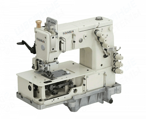 Трехигольная машина двойного цепного стежка с плоской платформой для выполнения швов «в замок», оснащена «тракторной» лапкой (двойная лапка, устанавливаемая в осях державки), позволяющая легко преодолевать поперечные швы, с пуллером.