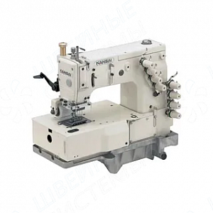 Двенадцатиигольная машина цепного стежка с плоской платформой, с заправкой эластичной нитки (резинки) в иглы, с пуллером.