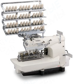 Тридцатитрехигольная машина двойного цепного стежка с плоской платформой для выполнения поперечной сборки и с декоративным верхним застилом, с заправкой эластичной резинки в петлитель, с устройством дозированной подачи, с пуллером.