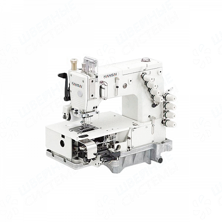 Восьмигольная машина двойного цепного стежка с плоской платформой для настрачивания резинки, с пуллером, с устройством дозированной подачи.