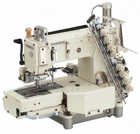 Шестиигольная машина двойного цепного стежка с цилиндрической платформой для притачивания резинки, с пуллером, с пневматической обрезкой нити и подъемом лапки.