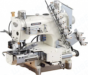 Четырехигольная машина с цилиндрической платформой (диаметр 110 мм) для притачивания резинки, с последовательно расположенными иглами, с механизмом горизонтального хода петлителя.
