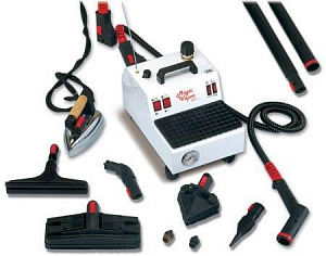 Многофункциональный парогенератор в комплекте с электропаровым утюгом и аксессуарами для влажно-тепловой уборки.