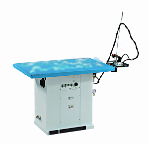 Прямоугольный стол с подогревом, вытяжкой, подачей пара и панелью управления. Оснащен парогенераторм и утюгом.