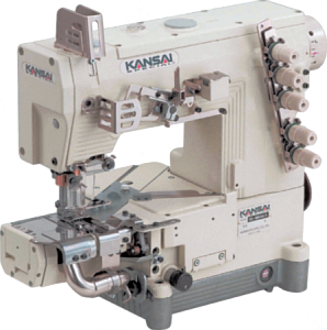 Трехигольная высокоскоростная плоскошовная машина с верхним и нижним застилом с цилиндрической платформой (диаметр 90 мм) для подгибки с левосторонней подрезкой края, с верхним продвижением ткани, с пневматической обрезкой нити и подъемом лапки.