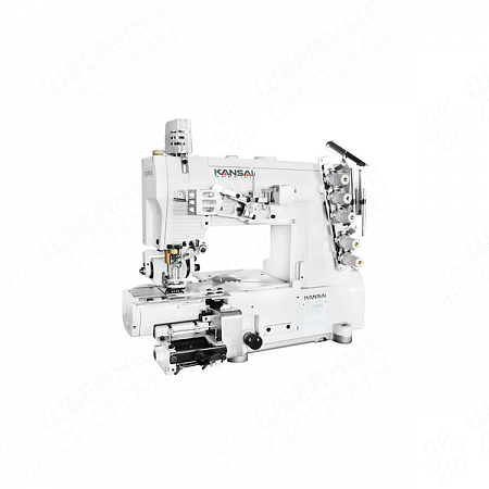 Трехигольная плоскошовная машина с верхним и нижним застилом с цилиндрической платформой (диаметр 90 мм) для притачивания резинки, с пуллером, с устройством дозированной подачи резинки.