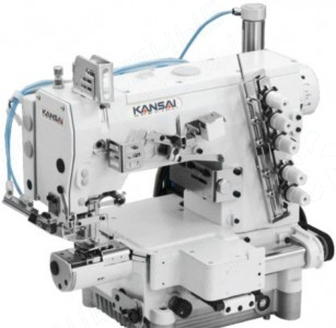 Трехигольная высокоскоростная плоскошовная машина с верхним и нижним застилом с цилиндрической платформой малого диаметра (60 мм) для для распошива влево оверлочных швов, верхним продвижением ткани, с электрической обрезкой нити и подъемом лапки.