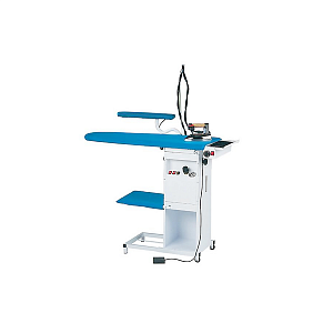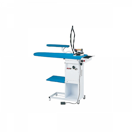 Утюжильный стол консольного типа с подогревом рабочей поверхности, вакуумным отсосом, поддувом, встроенным парогенератором и утюгом.